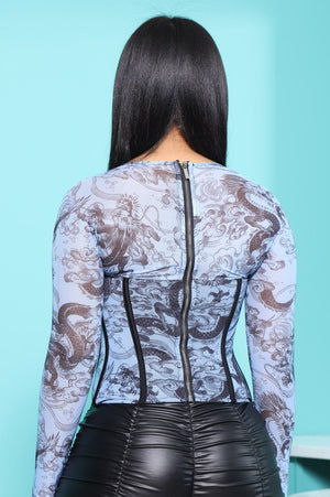 All night, literally all eyes will be on you in this top all night. This long mesh sleeve crop top features a corset design with low cut, chest cups and zippers in the back to close. This top is perfect to pair with high rise jeans.