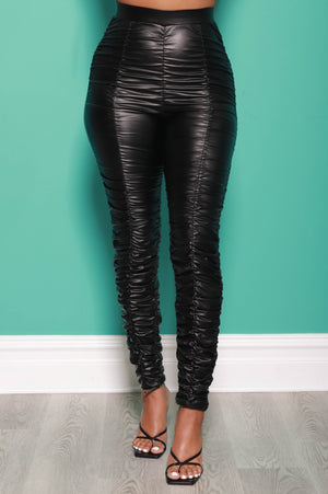 Be honest babe, you need these pants. These high rise faux leather pants are essential for a night out. These pants feature a ruched detail throughout the pants with a high rise fit. Perfect to pair with a sassy graphic t-shirt.