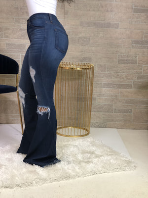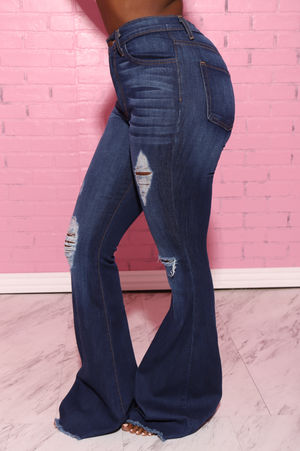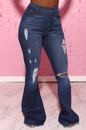 Here's your head start, start now. Be a look in these medium wash high rise, distressed wide legged bell bottom jeans. These jeans feature a five-button closure and a signature belt loop. These are perfect to pair with a sexy bodysuit or with a classic denim top!
