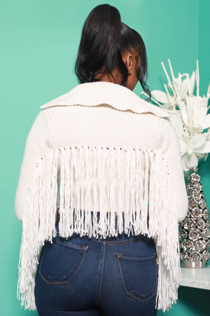 Everyone wants to be close to you and it's not just because of the sweater, or is it? This sweater has it all so who could blame us? This knit sweater features a dramatic collar, long sleeves and a cropped cut, while being adorned with fringe across the sleeves and bust. Pair over your favorite high waisted jeans.