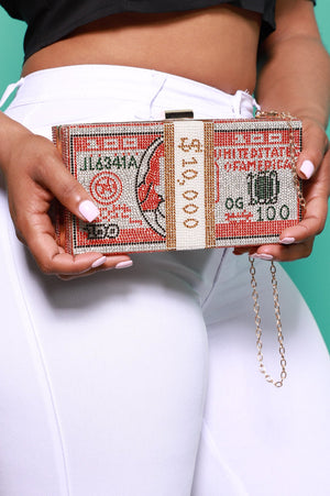 It's all about the currency! Be about our bag and stay focused. Keep on your grind and show off your million dollar mindset in this rhinestone printed rectangle clutch. Perfect to pair with anything and you're guaranteed to pop.