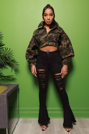 Sometimes it okay to spin the block and a few corners. Pop out in these distressed high rise jeans. These jeans feature extreme split distress down the front of the jeans. The jeans give a skinny leg fit until the end of the jean there's a distressed mini flare.