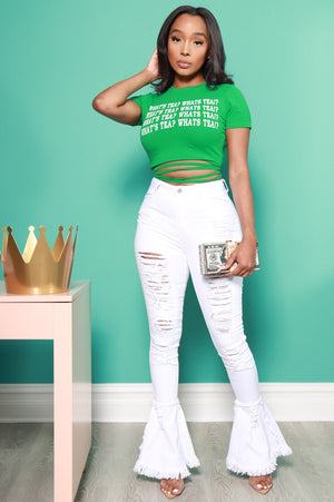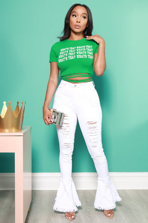 Sometimes it okay to spin the block and a few corners. Pop out in these distressed high rise jeans. These jeans feature extreme split distress down the front of the jeans. The jeans give a skinny leg fit until the end of the jean there's a distressed mini flare.