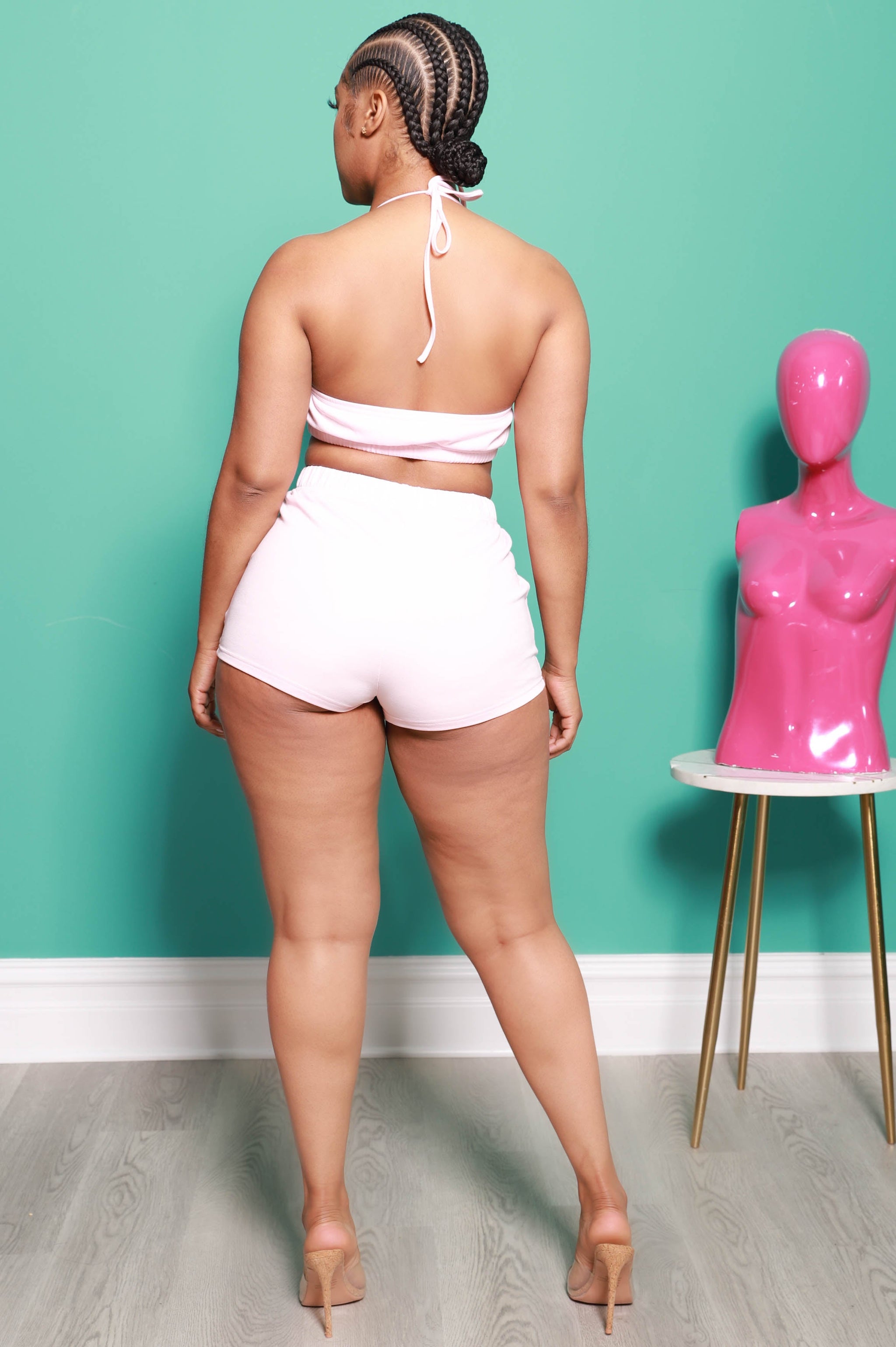 Are you daring enough to bare it all? This short set is definitely not for the faint of heart. A cropped halter back top with drawstring tie comes with matching jogger style shorts for a comfortable and bold look. Pair it with some sneakers or sandals to bring it all together.