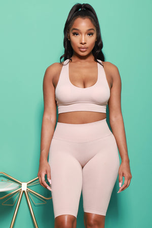 Give everything you've got with this sporty racerback bra and shorts set. The bra top is lined with a plunging front and ribbed. The shorts are the same stretchy ribbed material and ready to fit you like a glove.