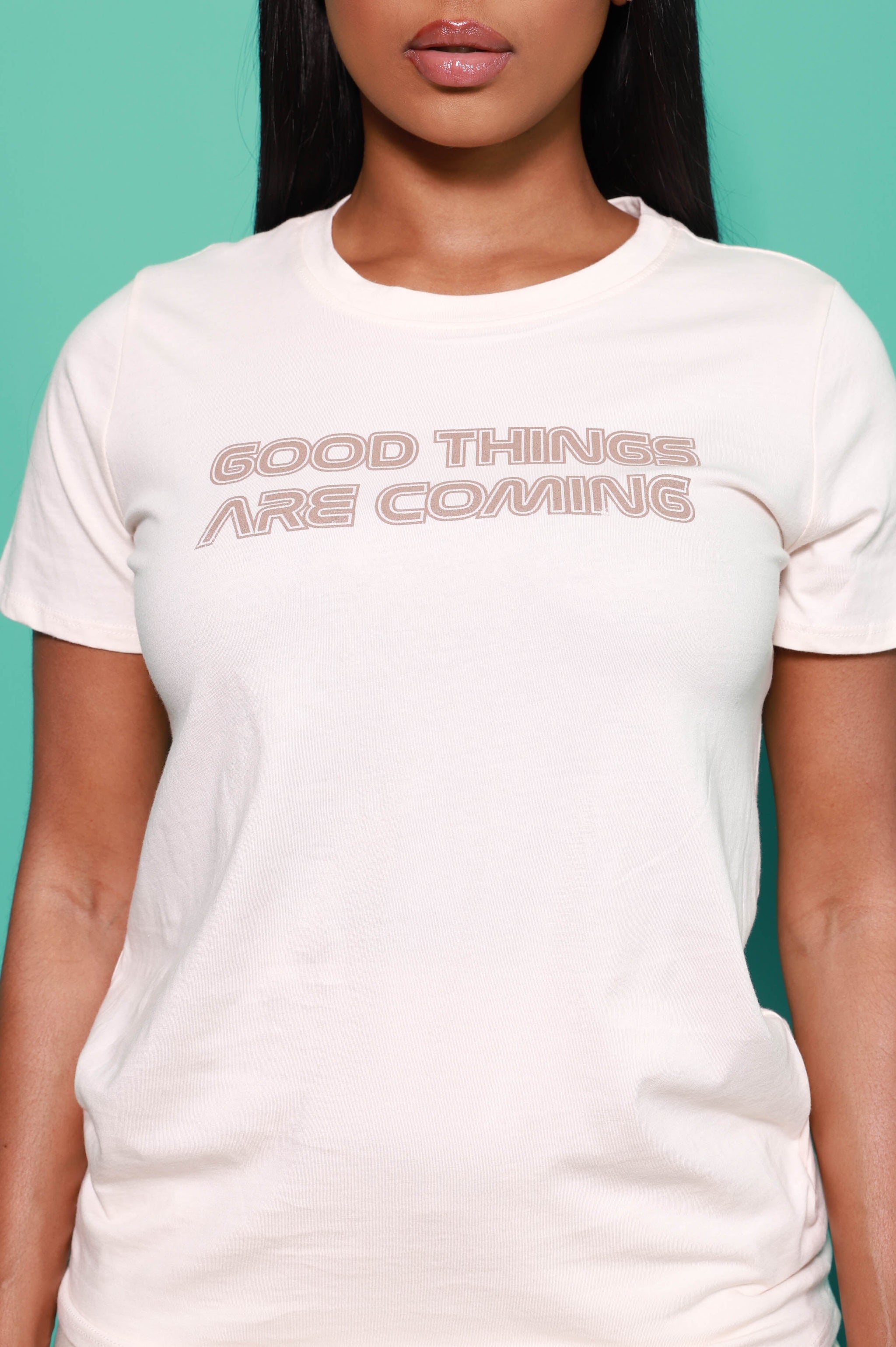 You already know good things are coming, so make sure everyone else does too! This natural cream colored t-shirt features brown font with "good things are coming" printed across the front. Ultra soft and ready to be paired with some jeans and sneakers for a relaxed look, ready to enjoy the good things.