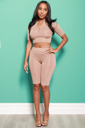 You don't need to dress up to look your best Girl, sometimes less is more. Prove that in this understated but incredible biker set. This is not your average set with its unique binding tape like material that will you keep you looking snatched. Featuring seams on the thighs of these mid thigh length biker shorts, it also has a matching t-shirt top with a quarter zip o-ring. Pair with your favorite sandals or sneakers.