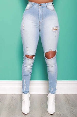 You want to stand out in a boring sea of average jeans Bestie? Look no further than these jeans. These light wash skinny jeans are are high waisted to keep that waist snatched, and features head fading and heavy rips in the knees. Pair this with your favorite bodysuit or crop top.
