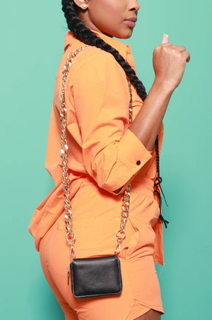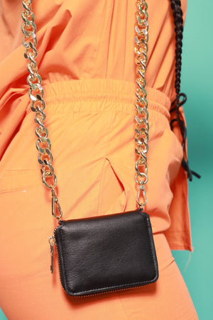 You're always looking pretty and cute, now you just need the accessories to match! This mini purse is perfect for adding some extra flair to a bold outfit. This purse is black faux leather with a gold long chain. Perfect for holding your card, lipstick or your airpods.
