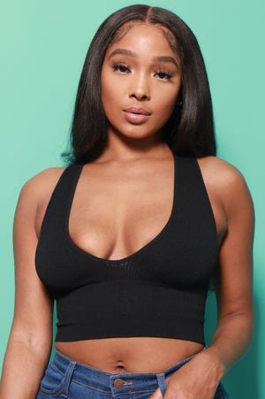 Low down, but not down low. Pop out in this v-neck, ribbed cropped tank. This sleeveless top has a full coverage on the back, with a low front v-neck cut. Perfect to pair with high rise bottoms.