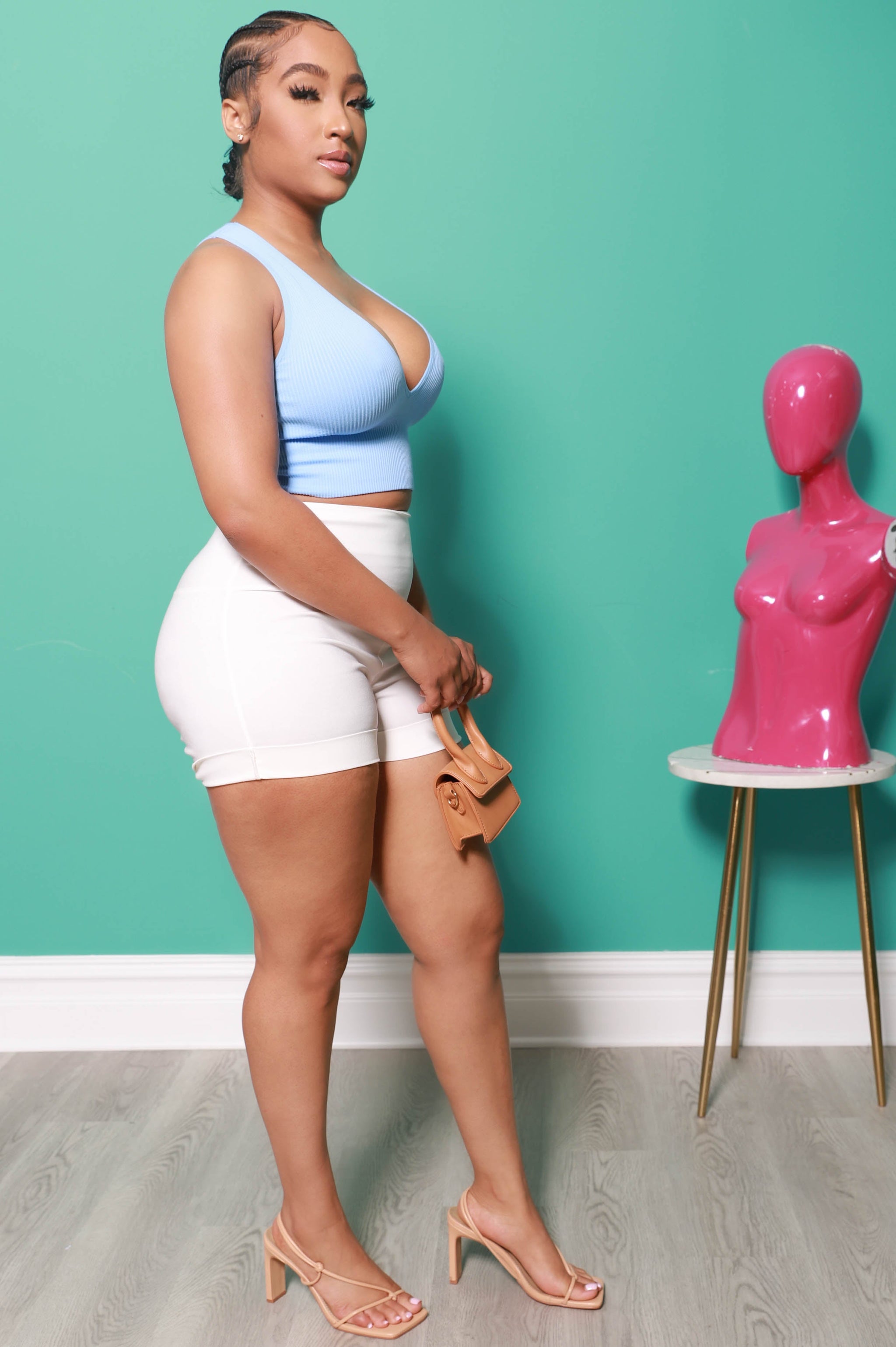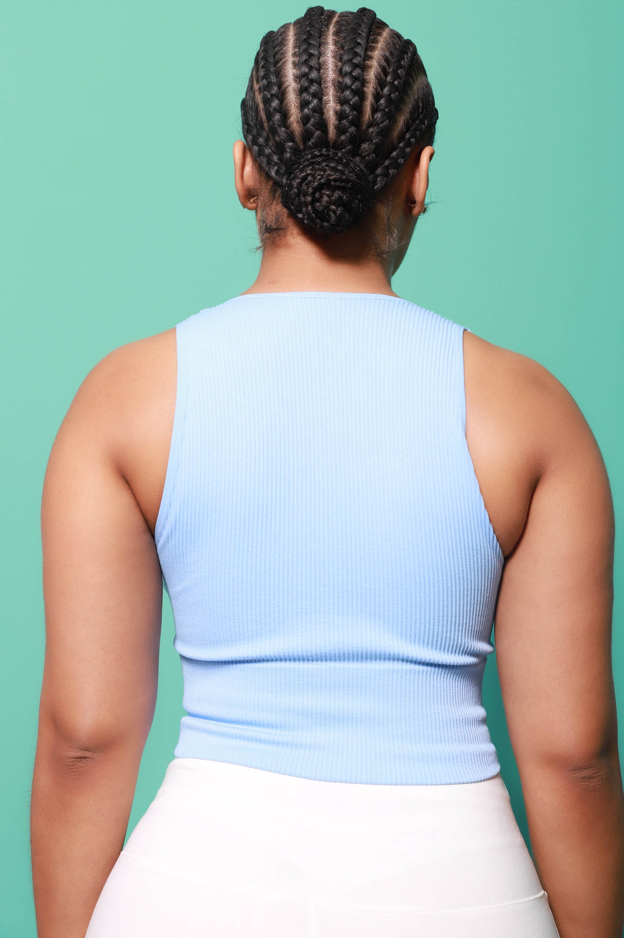 Low down, but not down low. Pop out in this v-neck, ribbed cropped tank. This sleeveless top has a full coverage on the back, with a low front v-neck cut. Perfect to pair with high rise bottoms.
