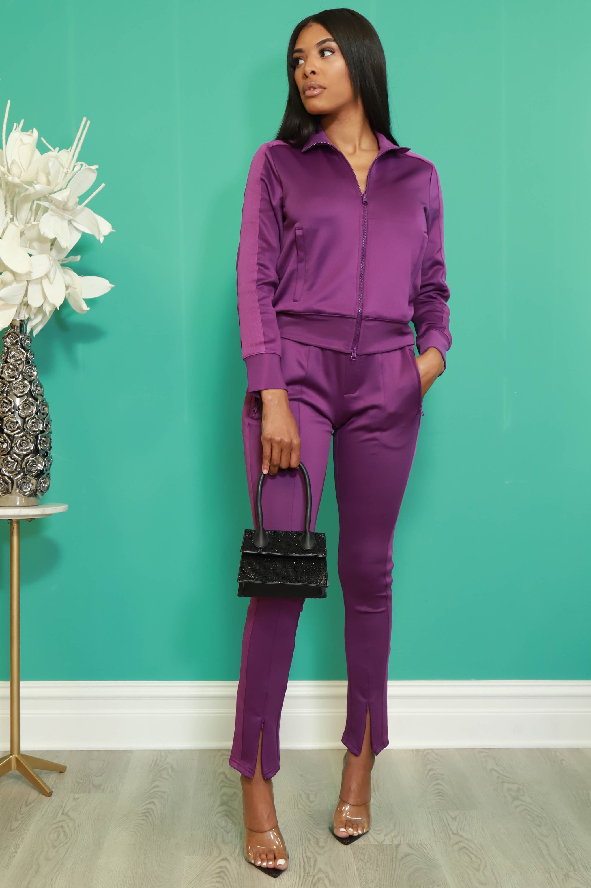 Somewhere between comfortable and sexy. Pop out for any occasion in this lined athletic tracksuit set. The top is a long sleeve jacket with a collar and zippers to close. The bottoms are high rise, stretchy lined track pants with a front opening at the end of the pants leg.
