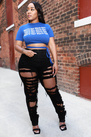 You in or you out? 'Cause I think I'm out! Pop out in these super distressed jeans. These jeans feature distressed detailing throughout the front and back of the jeans design. These are perfect to pair with a simple bodysuit or a graphic t-shirt.