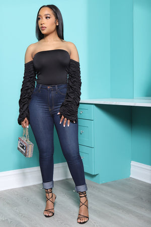 Be proactive, get live! Who doesn't love a good bodysuit? Pop out in this off the shoulder bodysuit. This bodysuit features a ruched sleeved design and is perfect to pair with high waist bottoms.