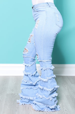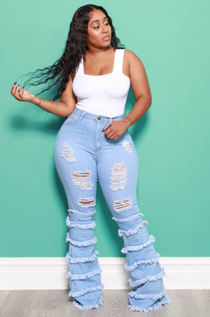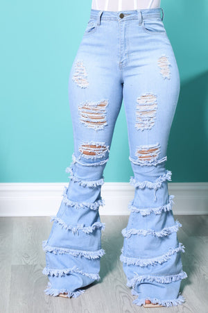 Promise are usually meant to be broken, but not this one. I promise you that you're going to look bomb in these jeans. These flared high waisted jeans feature a distressed detailing throughout with frayed layered starting around the knee area going down the pants leg.