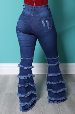 Promise are usually meant to be broken, but not this one. I promise you that you're going to look bomb in these jeans. These flared high waisted jeans feature a distressed detailing throughout with frayed layered starting around the knee area going down the pants leg.