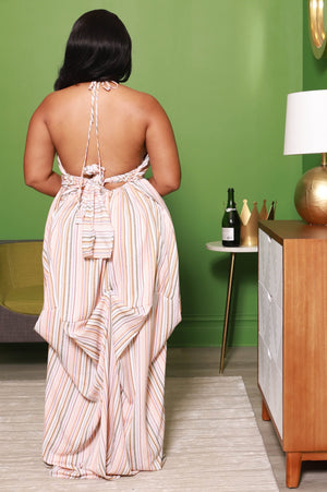 I'll get stripe to it, you need this dress. This maxi dress is summer ready with its loose gathered hem and halter tie back. Its snug where it should be and loose where you need a little extra flow. Add a cute beaded necklace and some strappy sandals for a hippie look.
