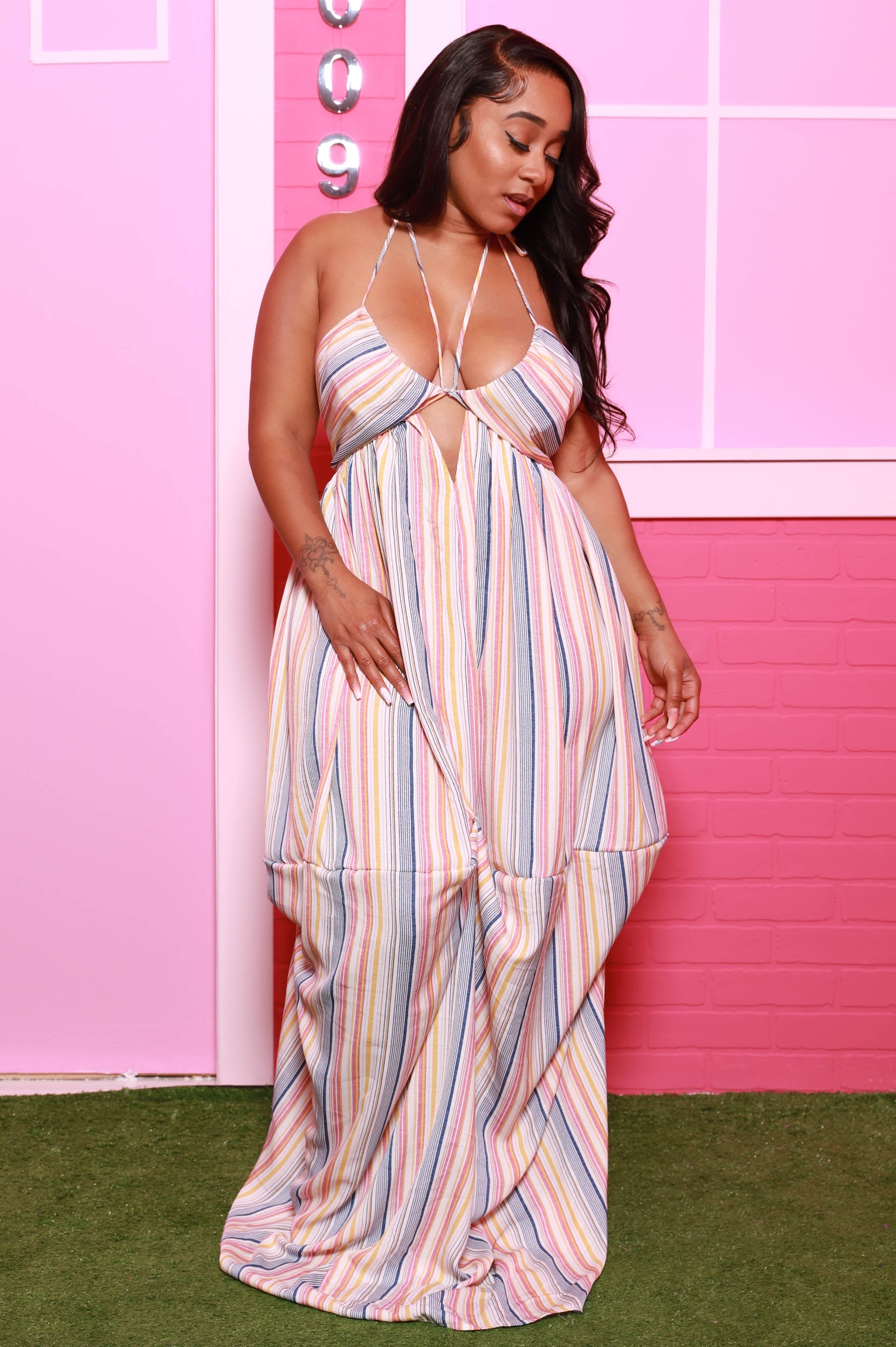 I'll get stripe to it, you need this dress. This maxi dress is summer ready with its loose gathered hem and halter tie back. Its snug where it should be and loose where you need a little extra flow. Add a cute beaded necklace and some strappy sandals for a hippie look.