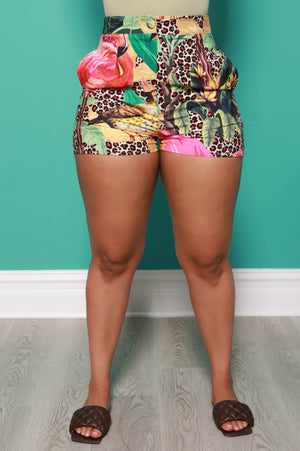 Whether you're taking on the tropical jungle or the urban jungle, you need these shorts to do it. These high waisted shorts are mid thigh length and feature a bold tropic print. Pair this with a crop top and get out into the wild.